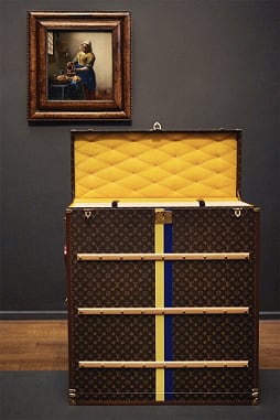 The special-order trunk was outfitted with brass corners, a brass key lock (based on a design created in 1890), and the iconic “LV” monogram canvas (which was originally designed in 1986 by Louis Vuitton’s son, Georges). The interior is outlined with a cheery yellow chevron-patterned cushion with hand-painted stripes. Yellow and blue stripes on the exterior are an homage to the painting’s muted hues. The elongated trunk’s size was specially designed to perfectly fit the painting. The trunk will ferry The Milkmaid from its home at The Rijksmuseum to the Ueno Royal Museum in Japan for a temporary exhibition.