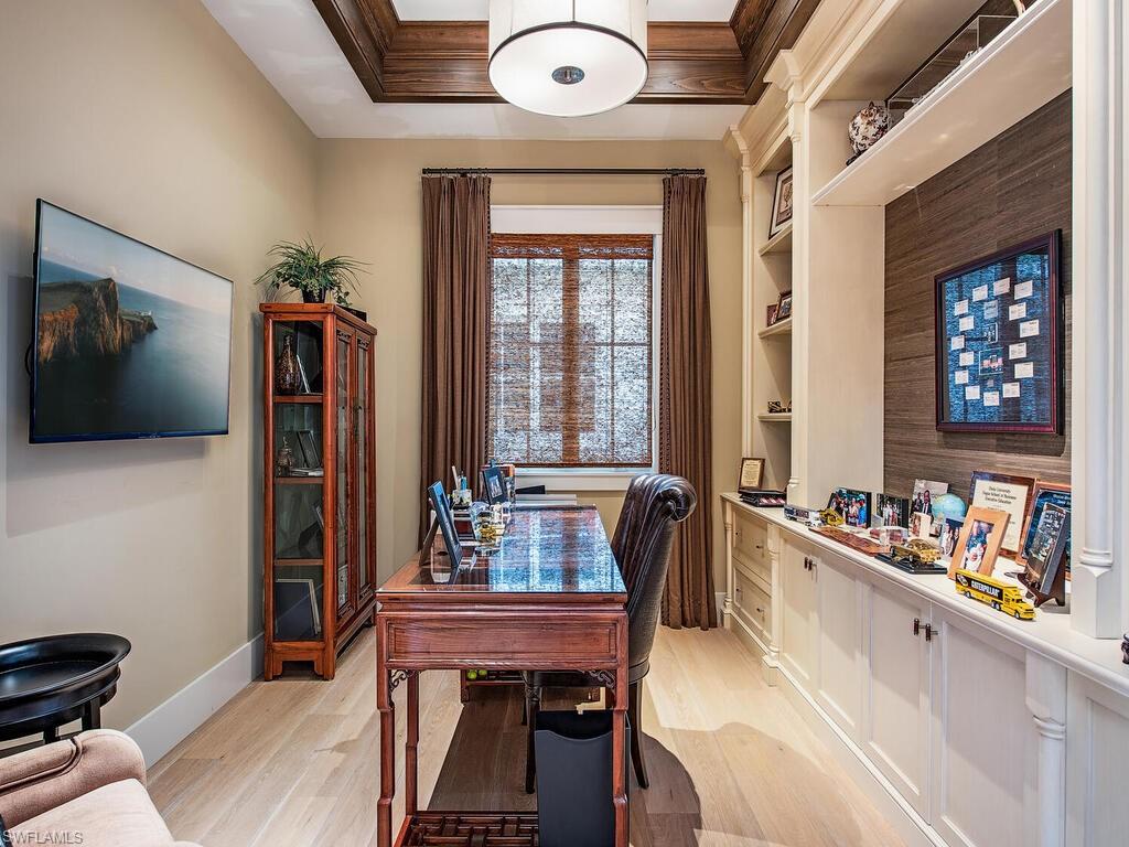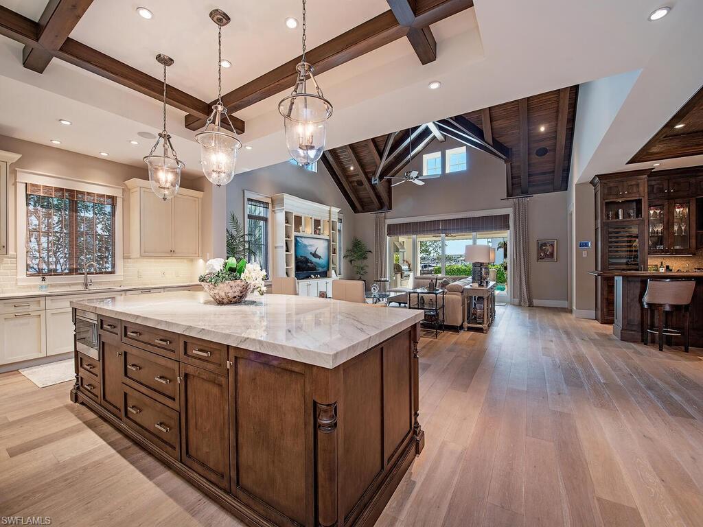 An exceptional waterfront residence in Mangrove Bay, this customized Amelia II plan perfectly captures the relaxed elegance of Naples living. Featuring rarely available direct water views in Mangrove Bay, the home blends the comfort of single-family design with the ease of condo-style convenience. Ideally situated in the heart of downtown, the 3,607 sq. ft. residence offers desirable southern exposure, a gas-heated pool and spa, a 2-car garage, superior finishes, and a covered boat slip with a 16,000 lb lift. The gourmet kitchen showcases Ruffino cabinetry, quartz countertops, and top-tier Wolf and Sub-Zero appliances. A thoughtfully reimagined open floor plan highlights a dramatic 13-foot bar equipped with a Sub-Zero wine cooler, beverage drawers, and a clear ice machine--designed for effortless entertaining. Wide-plank oak flooring, tongue-and-groove and wood beam ceilings, and expansive outdoor living spaces with a kitchen and automated screens/shutters further enhance the home's appeal. Community amenities include a wellness center, kayak storage, and a private boat ramp, with Baker Park and the Gordon River Greenway just steps away. Residents also enjoy proximity to the new Gulfshore Playhouse, along with the fine dining and boutique shopping of 5th Avenue. This home embodies the charm of Old Naples while offering all the benefits of a true waterfront lifestyle. Agents, see confidential remarks regarding floor plan.