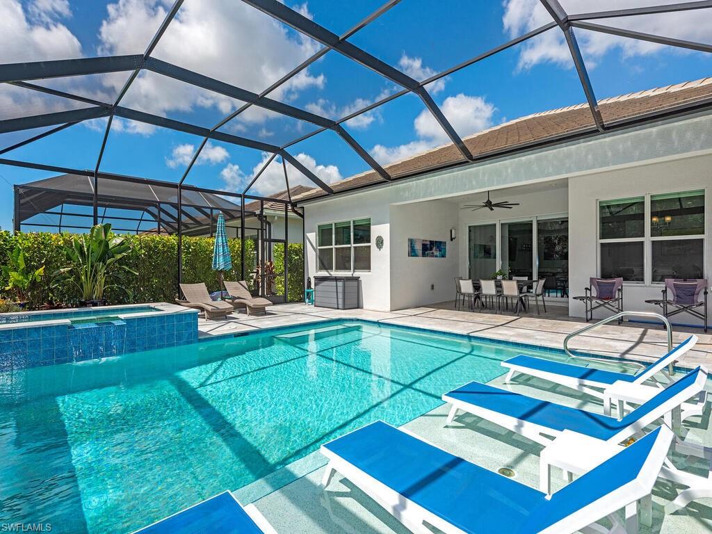 open, light, and bright floorplan with custom pool and spa boasting southern vistas over an expansive preserve view. Custom landscaping greets you upon arrival and your extended lanai will comfort you with a quiet and peaceful preserve setting. Luxury living awaits in this upgraded 3 bedroom plus den home, featuring an indoor storage room and oversized 2.5-car garage. Offered furnished, this elegant home is move-in ready for your immediate enjoyment, boasting impressive finishes including impact windows and doors, custom built-ins, LED lighting, and tile throughout. Valencia Bonita boasts a 45,000 square foot clubhouse with fitness center, fitness classes, pickleball and tennis courts, full service spa and salon, onsite restaurant, multiple resort-style pools, game and card room, dog parks, a social hall that hosts events and live entertainment and so much more.