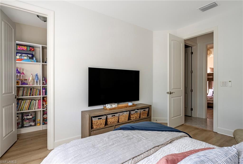 The primary bedroom features electronic blackout shades, a California Closet system, bonus flex space, and a bathroom with dual vanities and a walk-in shower.