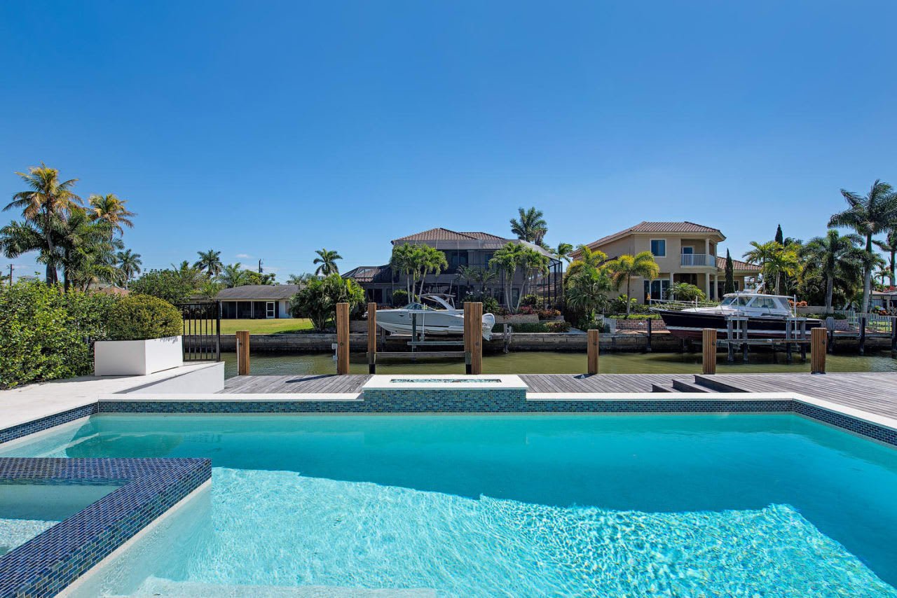 beyond. Concrete block construction with phenomenal high-end finishes and state-of-the-art home technology located in Royal Harbor, one of Naples premier boating neighborhoods. Adorned with wide plank white oak floors, exotic stone surfaces, and custom cabinets throughout. From the moment you approach a luxurious wood front door you feel the Zen tranquility created through the landscape. 21 foot ceilings and a wall of glass overlooking a resort style saltwater pool and spa surrounded by a Brazilian Teak deck. The open floorplan includes a large first floor master suit with wet bar, safe room, and a stunning limestone finished master bath. The gourmet kitchen is a chef’s dream and is accompanied by a floor to ceiling glass wine room. The second floor includes 3 en suit bedrooms, a large living room with wet bar, and a spacious deck overlooking the waterway. Other notable features include a 3-car garage with room for lifts, whole house audio, new seawall