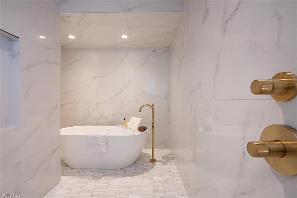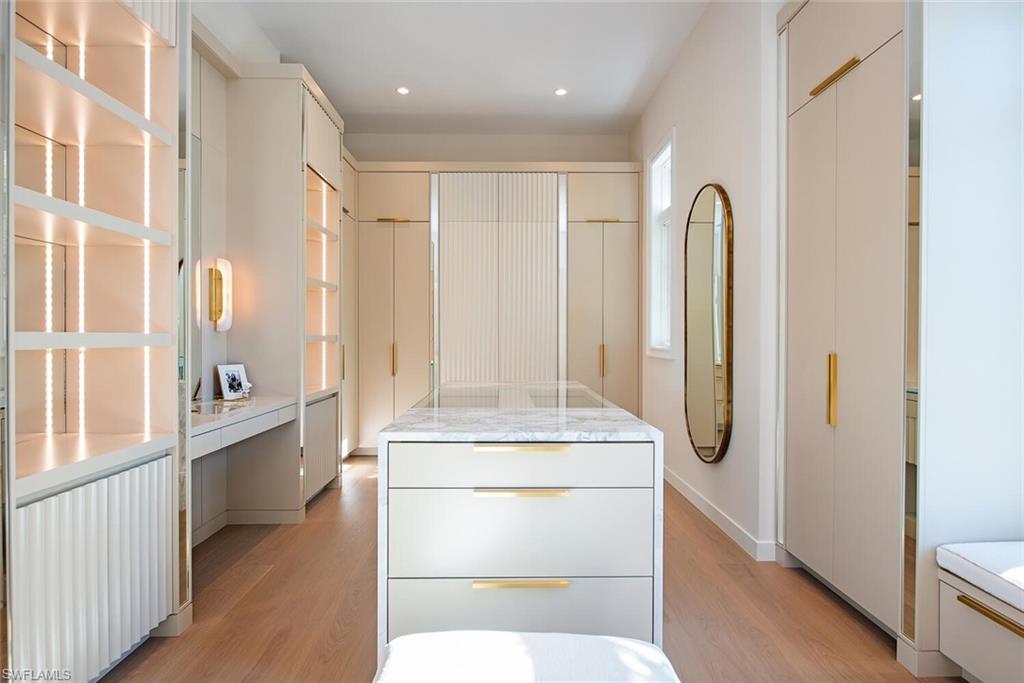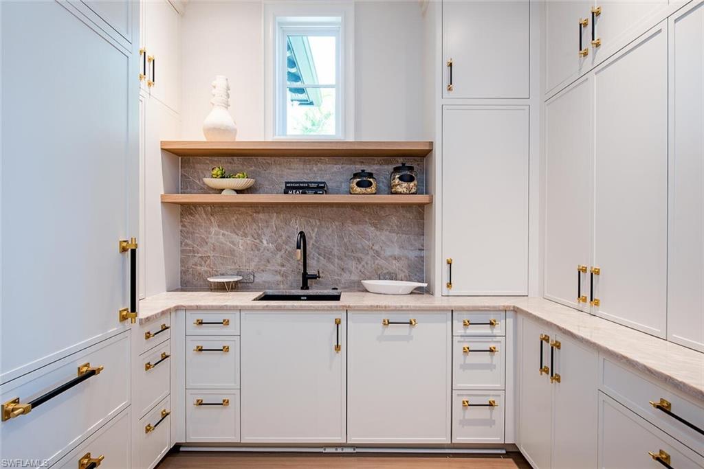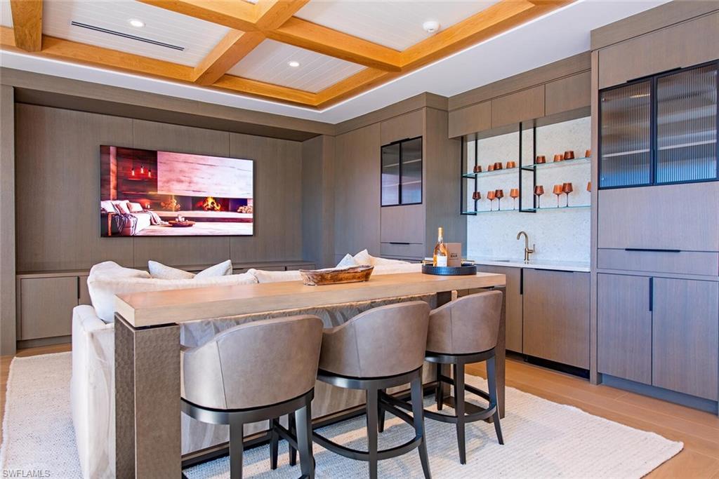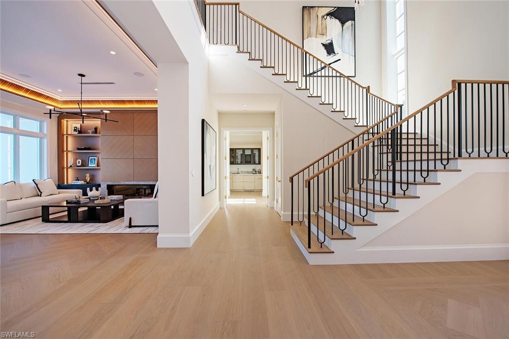 Positioned on a rare, gated corner double lot, and offering serene, wide water views, 275 Spring Line Drive is a fully remastered estate that prioritizes privacy, scale, and refined execution by Lotus Construction. Penned by Stofft Cooney Architects, this residence recently completed a comprehensive top-to-bottom renovation with curated interiors by Freestyle and offered fully furnished. Immediate access to deepwater boating along one of Naples' most prestigious bayfront corridors, every square foot of this custom residence has been reconsidered for both aesthetic sophistication and livable utility. The home spans multiple wings and includes a separate carriage house with three garage bays, supplementing the primary two-car garage for a total of five. Boating infrastructure includes two private docks and a jet ski platform, all set behind secure gates and framed by manicured grounds. The main residence features a fully equipped chef's kitchen with Wolf/Sub-Zero appliances, 6-burner gas range, dual Miele dishwashers, and a walk-through butler's pantry. Adjacent, a custom bar connects directly to the great room. A formal dining area anchors the front of the home with views of the garden, while a club/media lounge and fitness suite support leisure and wellness at scale. The primary suite occupies a secluded bayfront wing, offering direct access to the pool and spa. The bathroom is clad in stone and fitted with dual vanities, soaking tub, oversized shower, and two water closets with Toto Neorest 700 intelligent toilets. Separate dressing rooms complete the primary suite. Outdoor spaces include a saltwater pool with integrated spa, fire pit lounge, and expansive entertaining terraces.A 60kW full-home generator ensures uninterrupted function.