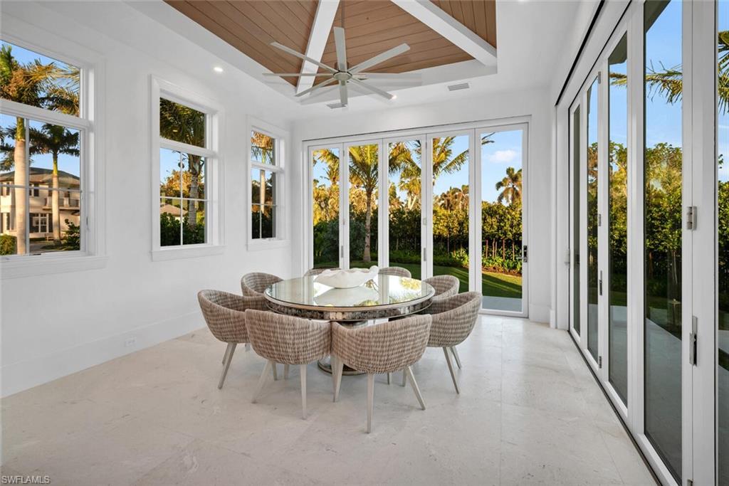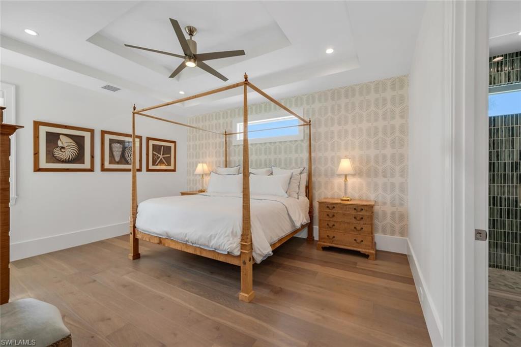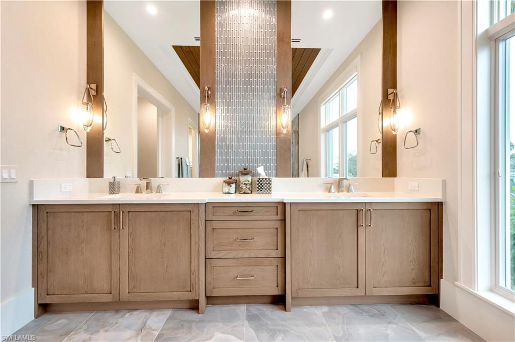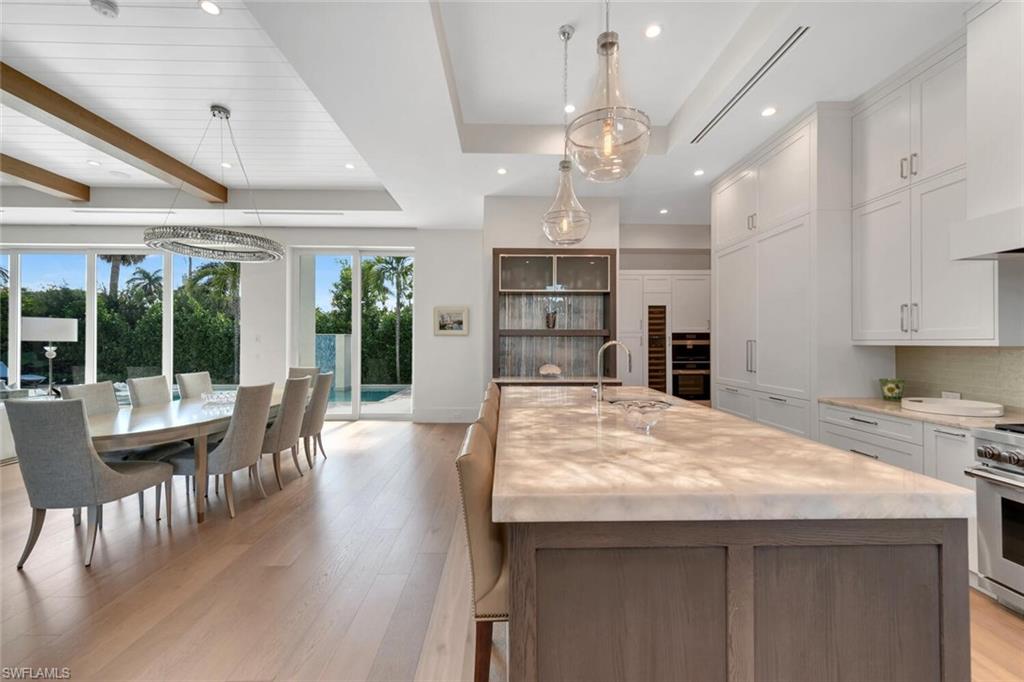 Privacy exemplified in this Stunning Luxury Estate located in Old Naples between the Four Seasons Naples Beach Resort and 5th Ave S. Entertainment District. This custom Old Naples home is expertly crafted through the combined vision of MHK Architecture & Planning, Freestyle Interior Design, and Gulfshore Homes. This spectacular 2024 home embodies sophistication, with 1,250 SF expansive primary suite includes a large bedroom and sitting area, dual closets completely finished with custom cabinetry and a home office with a stunning view through a full glass wall. Open flowing floor plan provides stunning views of a water feature as you enter the home. With 5,674 square feet of living area, the residence boasts an array of exquisite features, including extensive ceiling detailing and a spacious great room. 10' tall sliding glass door walls accompanied by hidden electric screens and shades showcase the pool, sun area, fire pit, and spacious yard. The air-conditioned lanai features accordion style impact glass sliders, electric screens, summer kitchen and television/entertainment area. A kitchen that is a chef's dream features a under-lit Cristallo quartzite 104' x 54" island, Wolf(r) 8 burner gas range, top-of-the-line appliances, complemented by a butler's pantry with a wine refrigerator, Miele steam oven, Miele coffee station, ice-maker, 2nd dishwasher, and more. Stunning bar off kitchen boasts an Alex Turco backlit back bar. Visually impressive glass wine cellar flanked by a stunning open staircase with spectacular multi-tiered chandelier. Second-floor guest bedrooms each offer en suite baths, a living room with option for complete privacy to main living area. Unique for Old Naples with features like a large .34 acre homesite featuring a 112' wide elevation, a private extensively landscaped yard with full size pool, expansive sun deck, fire pit, and room for outdoor recreation, social gatherings, or private putting green. This amazing residence is located on an extremely quiet street with a large horseshoe drive with parking for 10 cars, and only 3 blocks to the beach. The roof deck offers a peek of the gulf and stunning views of three lakes. A fifth bedroom is currently set up as an exercise room with infrared sauna and a steam shower. Laundries are located on both the main living area and 2nd floor. The luxurious pool features a wading/sunning shelf and waterfall. For the automotive enthusiast, the 3-car garage with power outlet for electric vehicle charging and room for 3 lifts. 2nd story floor solid poured concrete for peace of mind quite separation. The home features a full home Generac(r) generator with transfer switch and 1000-gallon buried propane tank, along with Carrier's most advanced HVAC, the Carrier Infinity(r), with humidity and mold prevention. Home is prepped for installation of an elevator. Toto Washlet+(r) automatic water closets featured in the primary bath and powder room. This residence is truly a haven of tranquility and privacy.