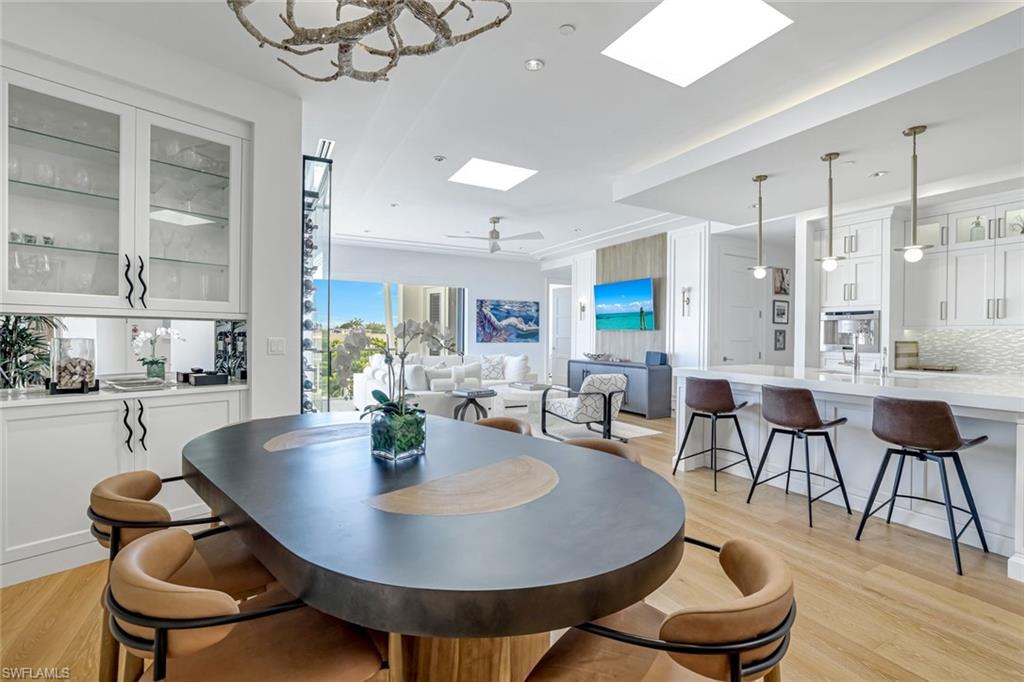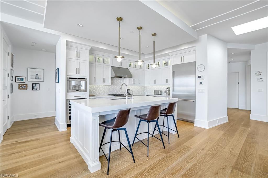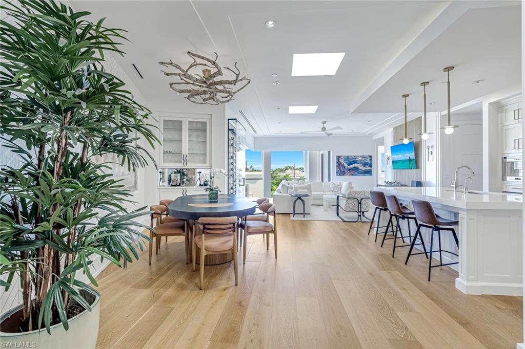 The open-concept design boasts 10-foot ceilings and white oak flooring throughout, creating a bright and airy atmosphere that blends indoor and outdoor living. A spacious private terrace enhances this lifestyle, offering the perfect setting to entertain or simply enjoy the energy of Old Naples.