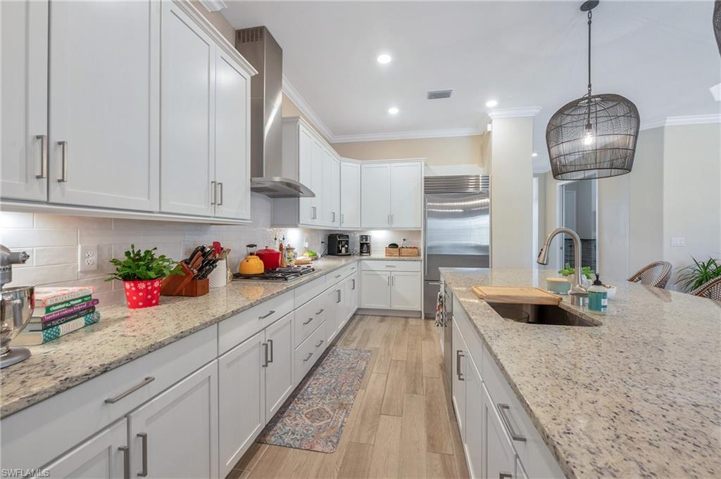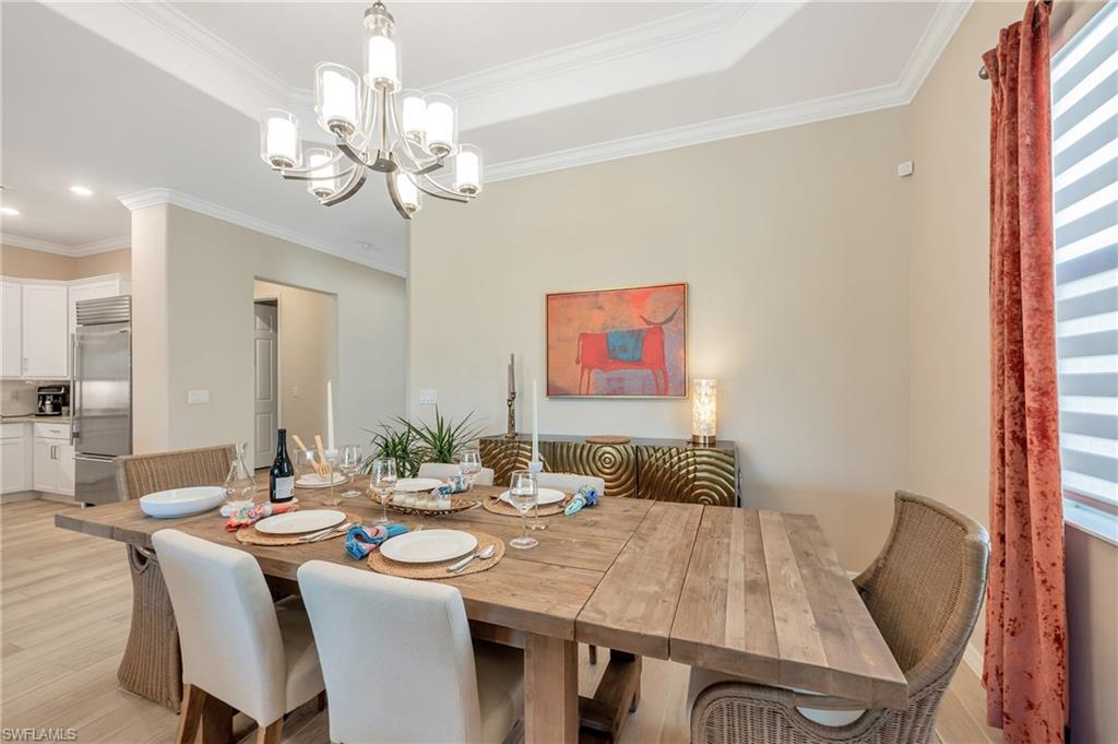 Inside, the gourmet kitchen is a chef's dream, featuring $26,000 in upgrades: a Subzero refrigerator, Wolf stovetop, oven, and microwave, plus a single-bowl sink and new disposal. The home also includes motorized blinds in the primary suite, dining room, front door, and sliders, as well as crown molding throughout. The insulated, air-conditioned garage includes an elevated storage system--keeping things organized and comfortable year-round.
