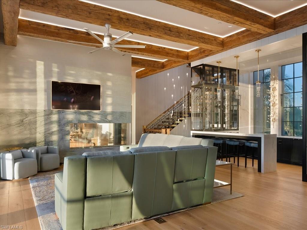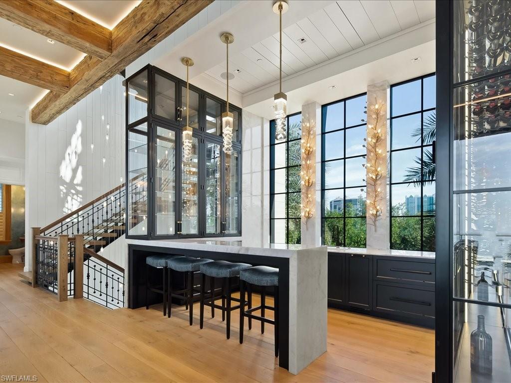 A stunning new home in The Strand at Bay Colony - one of Naples' most exclusive beachfront communities. Designed by Stofft Cooney Architects and built by BCB Homes, this 5-bedroom, 5.5-bath custom residence blends contemporary coastal design with timeless craftsmanship. Light-filled open spaces feature wide-plank Legno Bastone floors, a 3-sided fireplace, and incredible natural finishes throughout. The gourmet kitchen includes high end appliances, Blue Roma quartzite counters, a full butler's pantry, and a 400-bottle wine room. The top-floor primary suite offers sweeping Gulf views, dual closets, a spa bath, morning bar, and fitness studio. Outdoor living is a priority here with a resort-style pool, water feature wall, EVO grill, and reclaimed pecky cypress ceilings. It's built to the highest standards with hurricane-rated windows & doors, generator, Control4 home automation, and private elevator. Wake up to the sound of the surf and walk straight onto the private sands of Bay Colony, or spend the day at the Beach and Tennis Club enjoying oceanfront dining and poolside relaxation. Behind you is 570 acres of untouched conservation land which offers a rare balance of nature and total privacy along Naples' most coveted coastline.