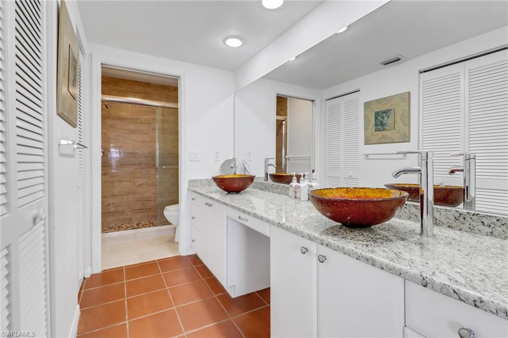 Upon entering, the unit welcomes you with cathedral ceilings, a generously sized living area, and a well-appointed kitchen equipped with ample counter space, a breakfast bar, double sink, refrigerator, stove, dishwasher, and microwave. Enjoy meals in either of the two enclosed lanai areas with the back lanai offering panoramic views of the lake and surrounding amenities.